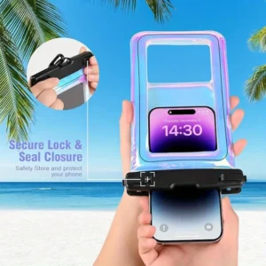 - Description: This small, transparent pouch is an absolute must-have for any trip to the beach, pool, or waterpark. It features a secure, waterproof seal (like a ziplock and clasp system) that keeps your phone completely dry, even underwater. The clear material allows you to still use your touchscreen and take photos and videos without removing the phone from the pouch.
